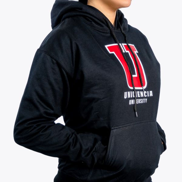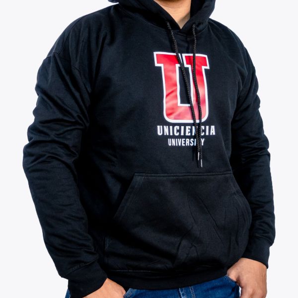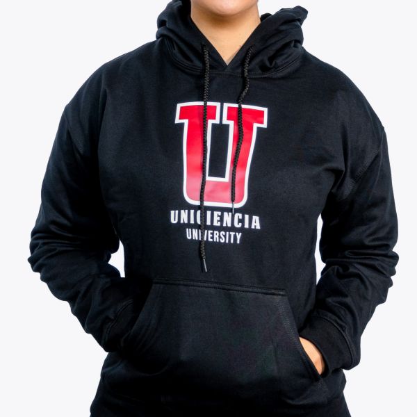 Buzo Unisex tipo hoodie 50% Algodón y 50% Poliéster, con capucha y cordón del mismo color de la prenda. Estampado “U” full color.